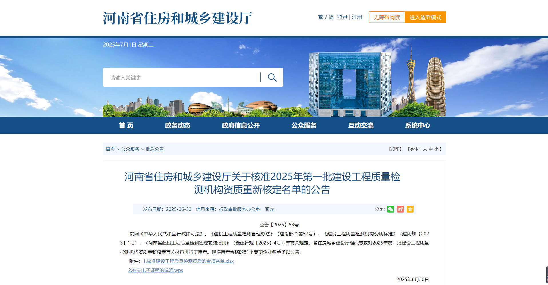 熱烈祝賀我司通過河南省住建廳2025年第一批建設(shè)工程質(zhì)量檢測機(jī)構(gòu)資質(zhì)重新核定!!!